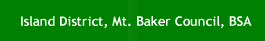 Mount Baker CouncilIsland District is a part of the Mount Baker Council of the Boy Scouts of America. Mount Baker Council serves the youth of Snohomish, Skagit, Whatcom, San Juan and Island counties. That covers a wide area -- from just north of Seattle to the Canadian border, and from the Cascade Crest to Admiralty Inlet and the Strait of Georgia. Our council is growing in leaps and bounds. For more on the Mount Baker Council, visit their web site at http://www.mtbakerbsa.org or get a copy of the Mountain Echo from the Council office.